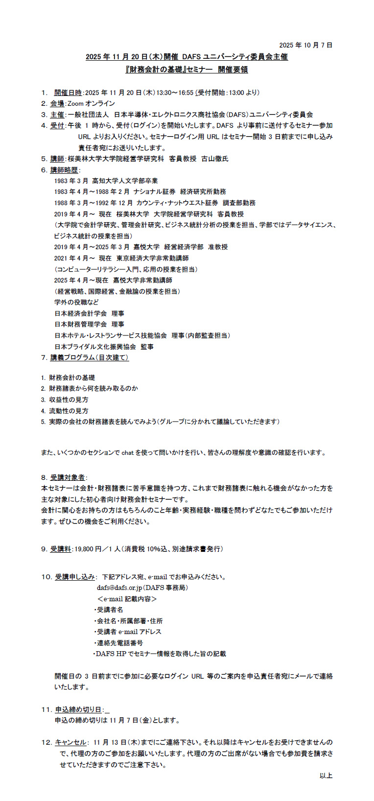 主 催: | 日本半導体・エレクトロニクス商社協会(DAFS) ユニバーシティ委員会 |